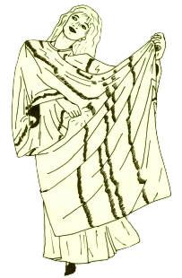 Wellenbewegungen mit dem Oberkörper, lockeres Schwingen der Haare, die bei diesem Tanz sehr wichtig sind. Das weite Überkleid wird im Rhythmus mitgeschwungen.