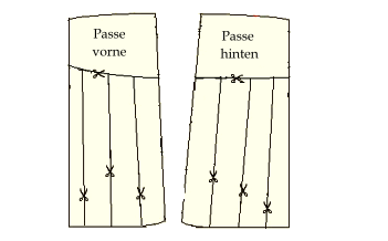 - vordere und hintere Mitte ist bei der Passe und dem Rock der Fadenlauf